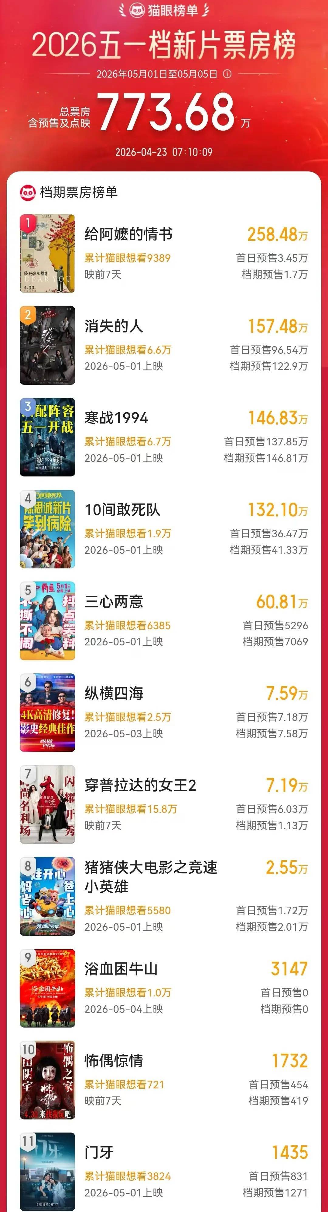 依据猫眼专业版数据显示,当下五一档共有11部新片开启预售,它们分别是《寒战1994》《消失的人》《10间敢死队》《纵横四海》《穿普拉达的女王2》《给阿嬷的情书》《猪猪侠大电影之竞速小英雄》《三心两意》《浴血困牛山》《门牙》《怖偶精情》。